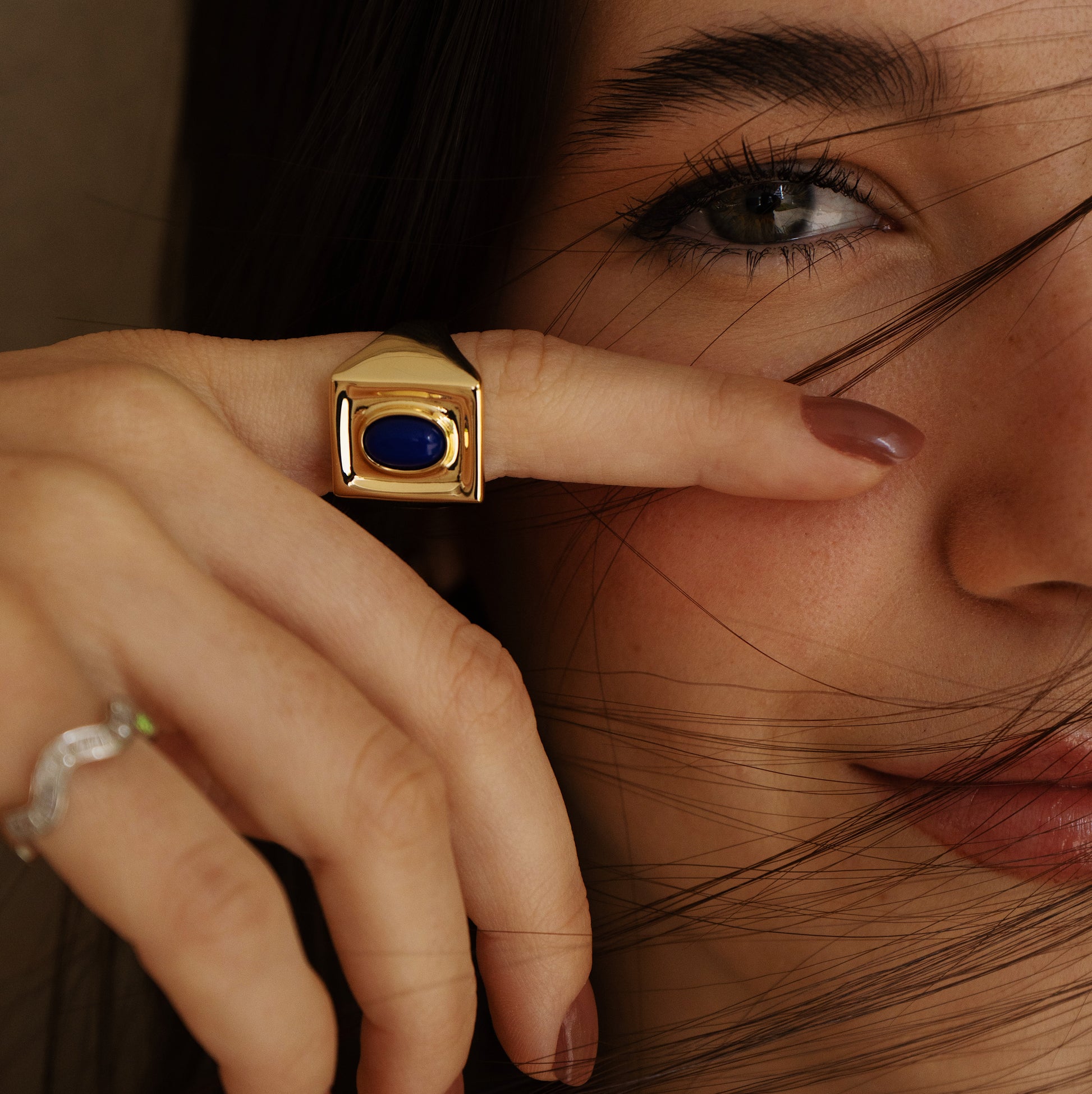 O Anel Rebeca é marcante e sofisticado, com design quadrado e acabamento em banho dourado. No centro, uma pedra de lápis-lazúli reconstituÃdo em azul intenso traz personalidade e elegância, transformando a peça em destaque para qualquer produção.