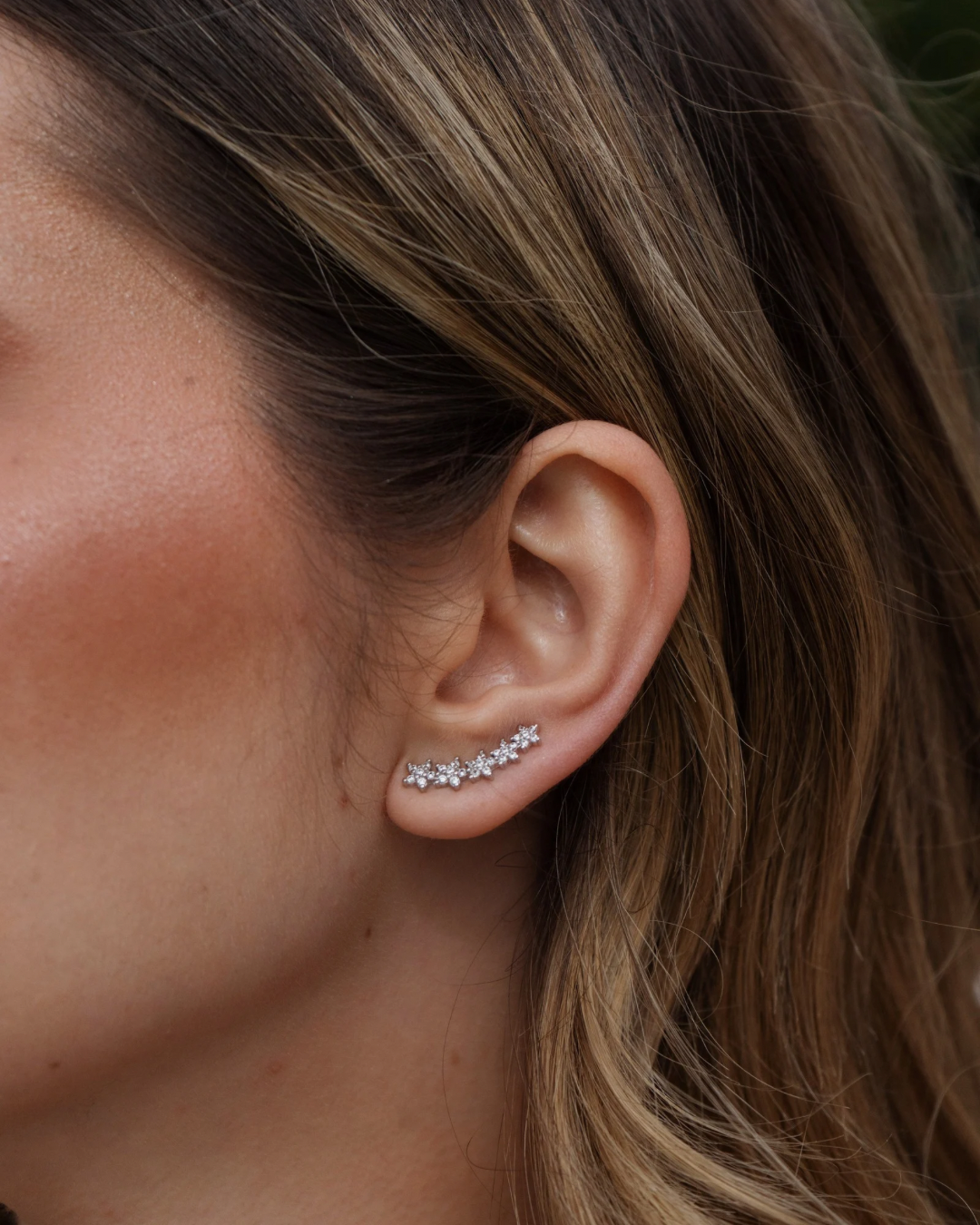 um ear cuff em prata 925 que desenha o contorno da orelha com pequenas flores de brilho, criando um efeito leve, iluminado e super feminino.