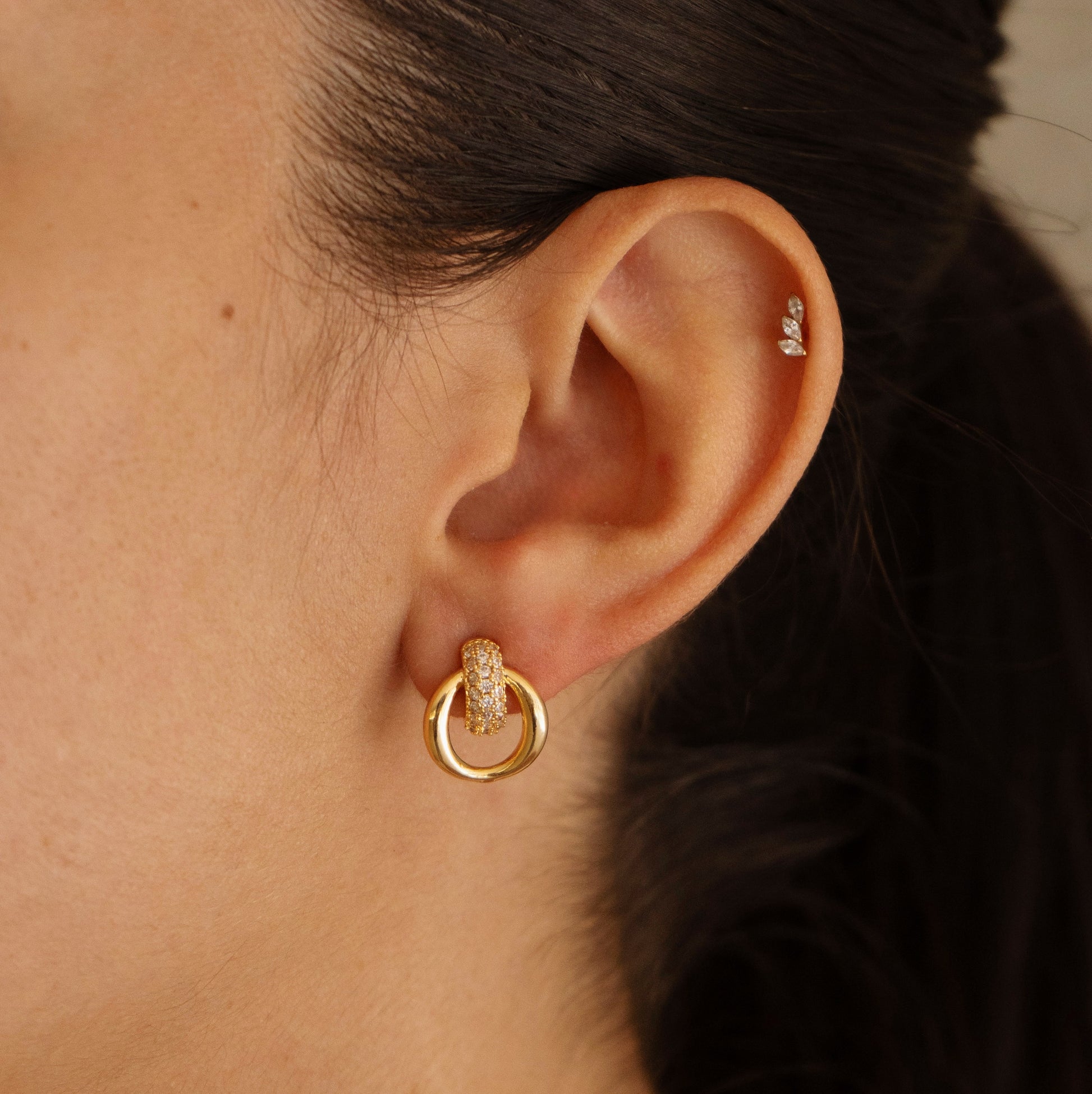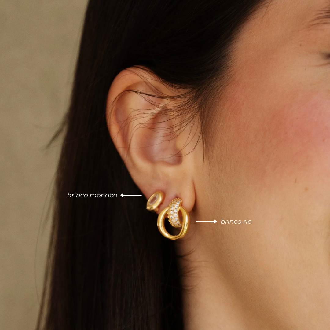 O Brinco Rio é delicado e moderno, confeccionado em banho dourado com design entrelaçado. Seu formato redondo vazado é realçado por zircônias cravejadas, criando um brilho sutil e elegante. Uma peça versátil, perfeita para iluminar o visual no dia a dia ou em produções especiais.
