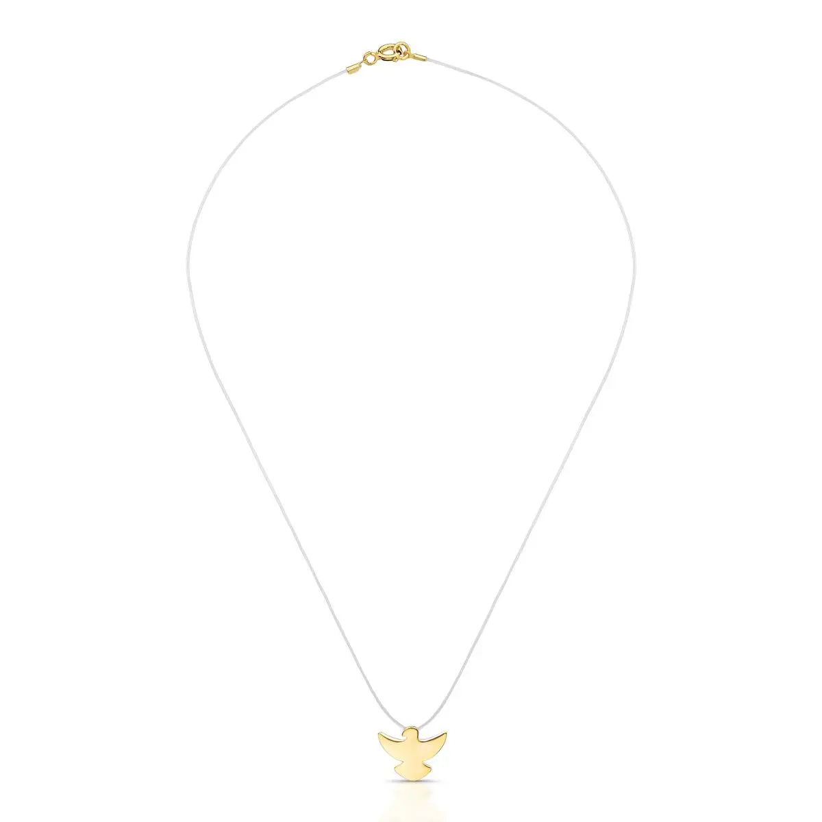 um pingente do espírito santo em banho dourado, delicado e minimalista, que traz a sensação de proteção, paz e luz bem pertinho do coração.