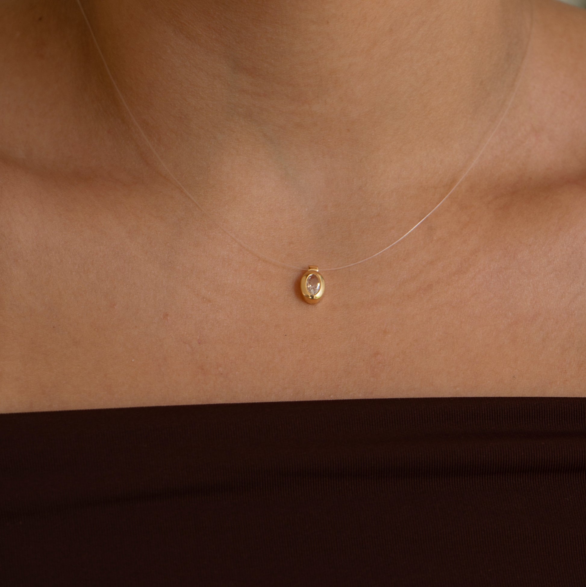 O Colar Mônaco é minimalista e sofisticado, com fio de nylon que garante um efeito de “joia flutuanteâ€. O pingente oval em banho dourado é cravejado com cristal incolor, trazendo brilho delicado e elegante para qualquer ocasião.