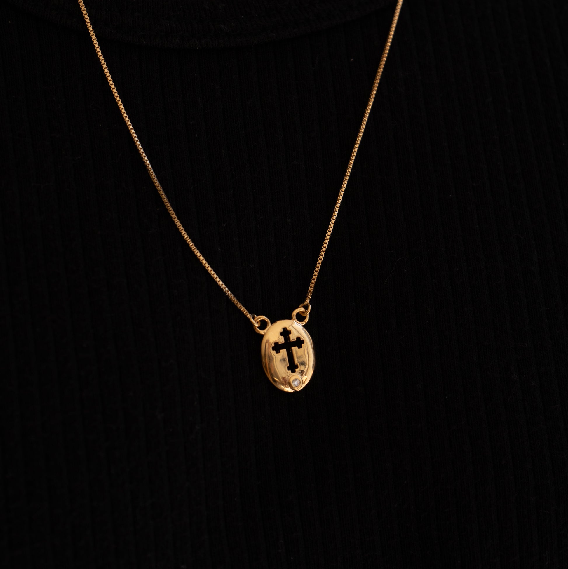 O Escapulário Noah é uma joia de design delicado, confeccionada em liga metálica de cobre e zinco com banho de ouro 18k, trazendo simbolismo e sofisticação. Possui corrente de 60 cm em malha veneziana e pingentes ovais com imagens vazadas da cruz e do Divino EspÃrito Santo, adornados por zircônias que acrescentam brilho sutil. Uma peça significativa para expressar fé com estilo.