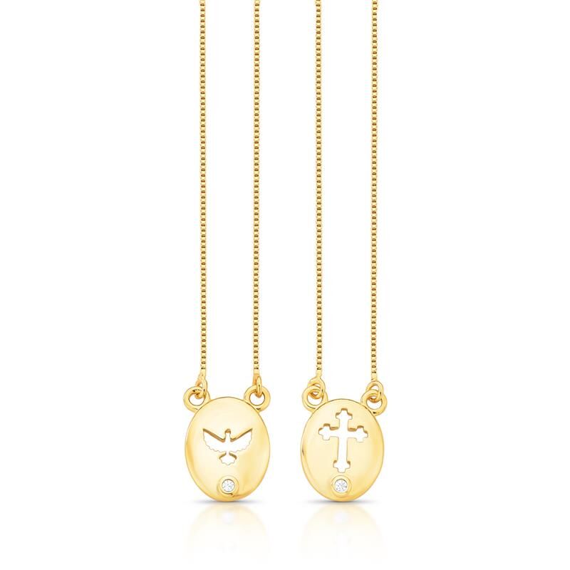 pingentes: ovais com imagens vazadas (cruz e EspÃrito Santo) + zircônia