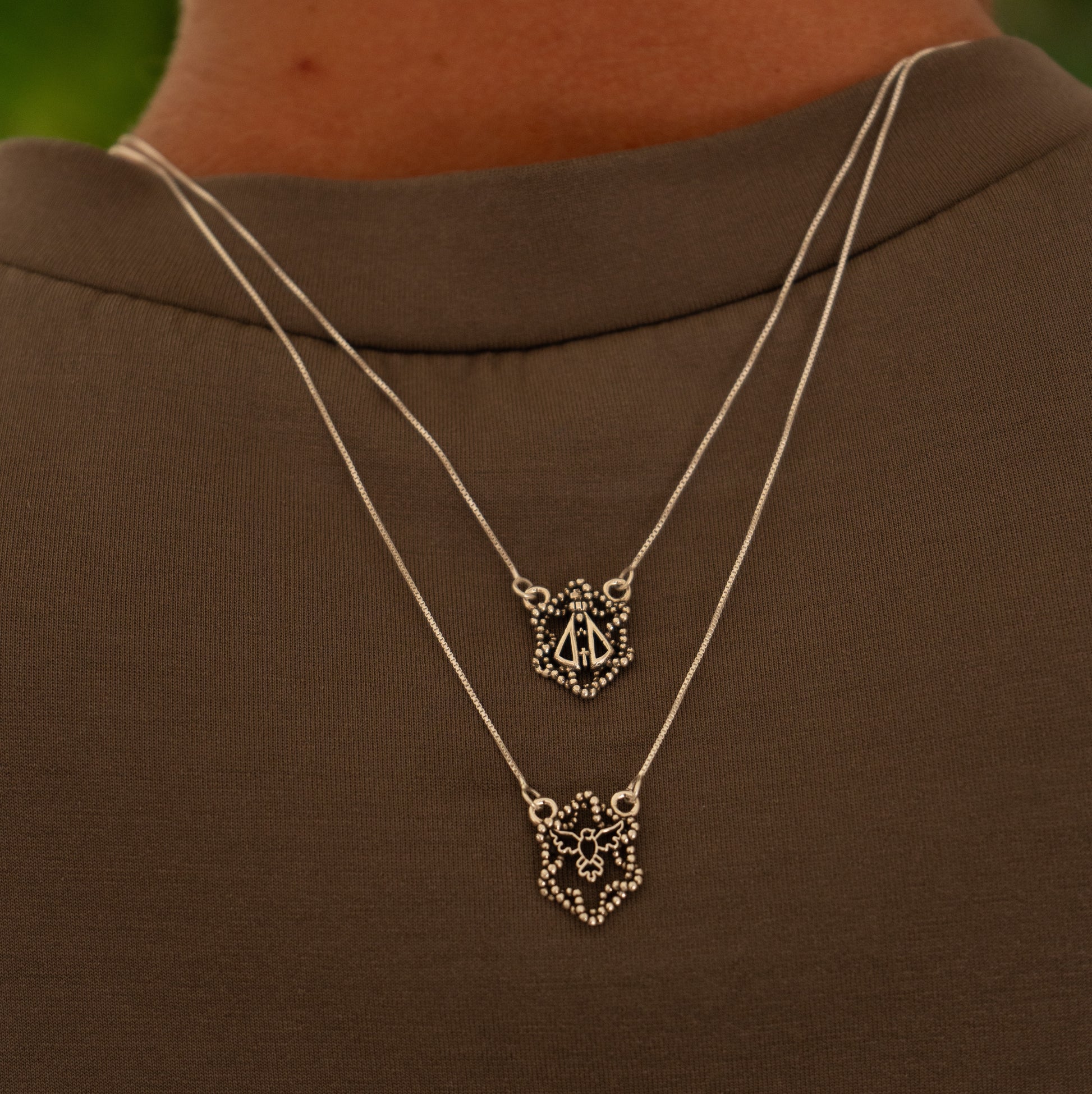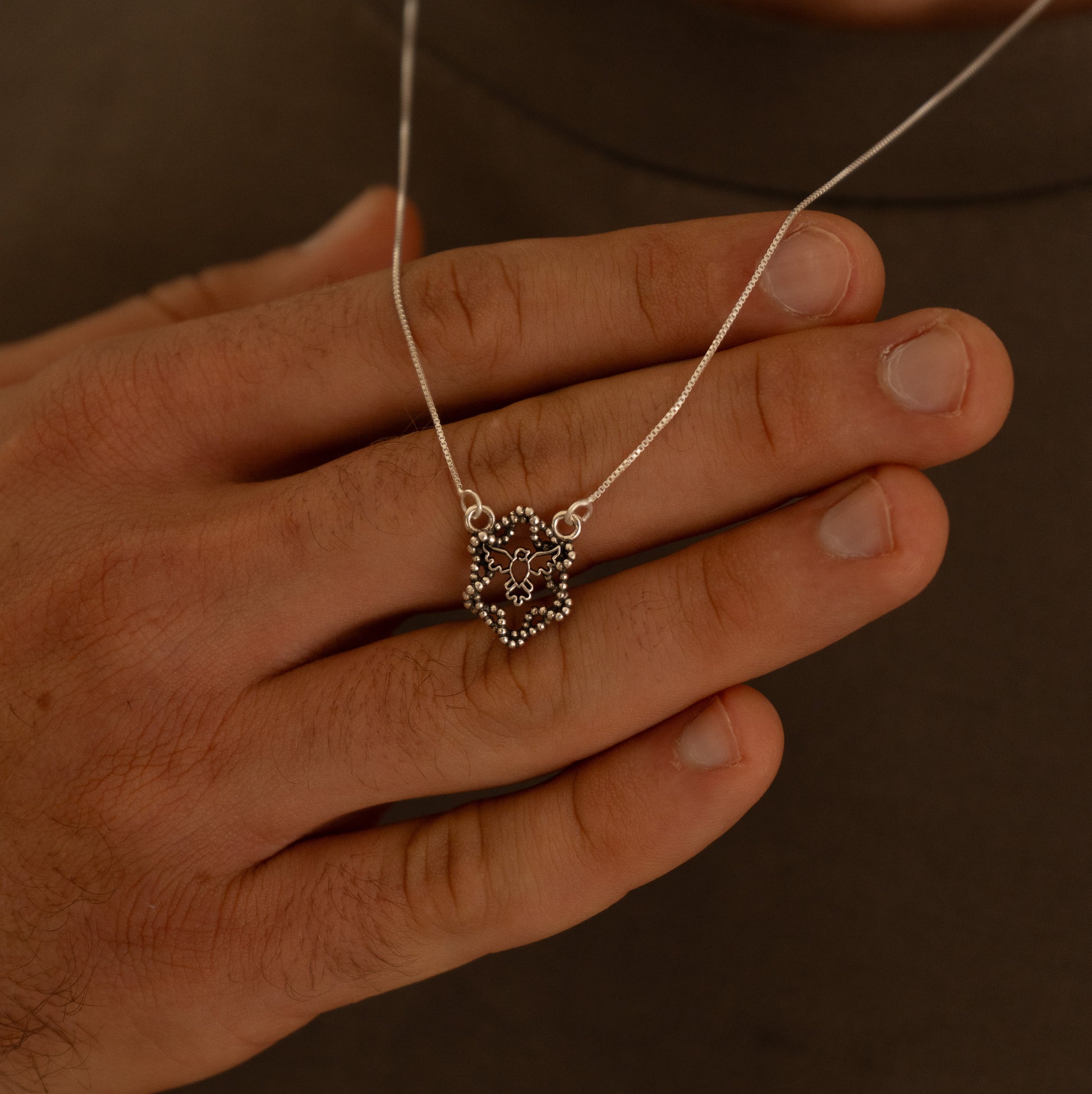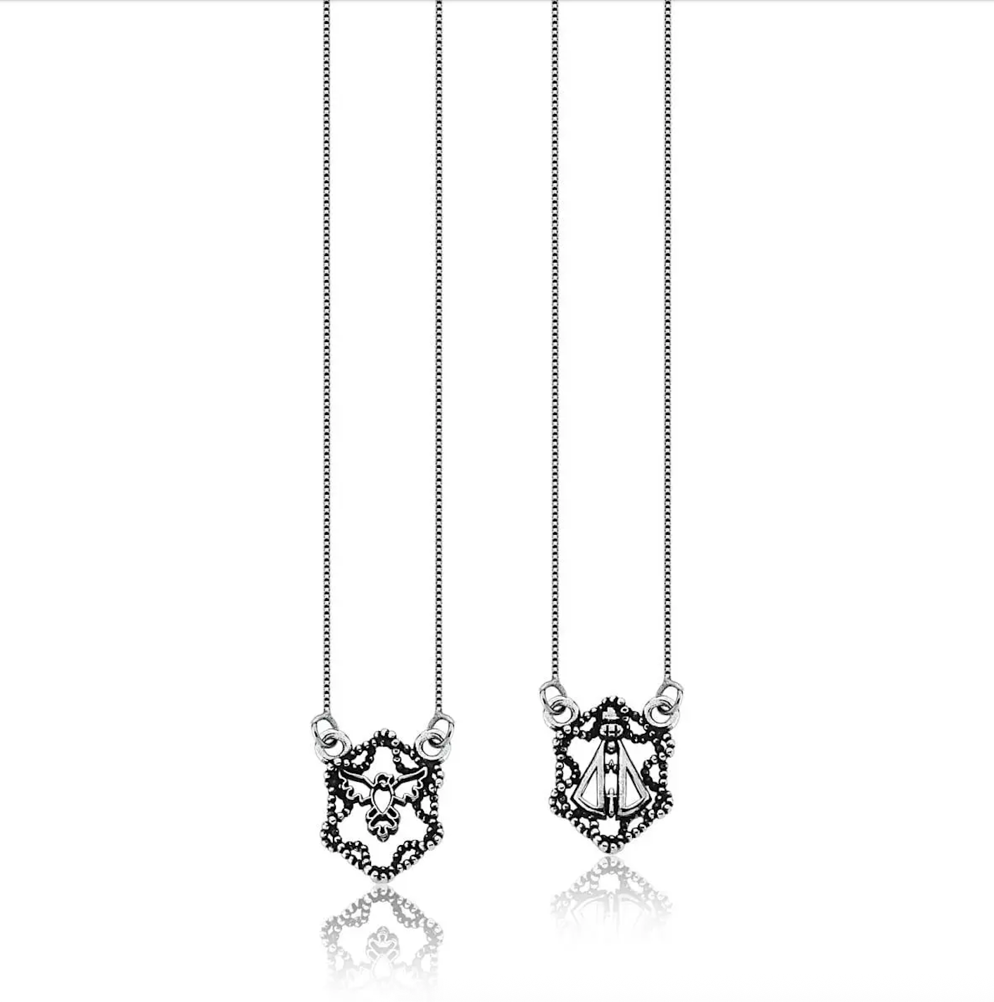 O Escapulário Rafael é confeccionado em prata 925 envelhecida, com corrente em malha veneziana que garante resistência e elegância. Os pingentes lisos trazem imagens vazadas de Nossa Senhora Aparecida e do Divino EspÃrito Santo, sÃmbolos de fé e proteção. Uma peça atemporal, perfeita para expressar devoção com estilo.